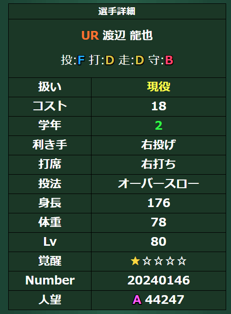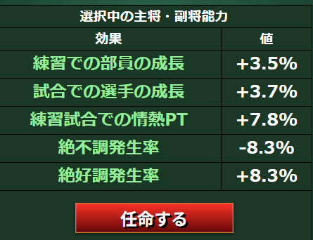 現在の人望値は44247。私が記録しているデータでは、秋季大会前で36231だったので、約3ヶ月で8016伸びた事になります。この調子で行けば、次の3ヶ月でカンストまで視野に入ります。とはいえ主将は3ヶ月間変更不可ですので、先を見越しての変更となりました。